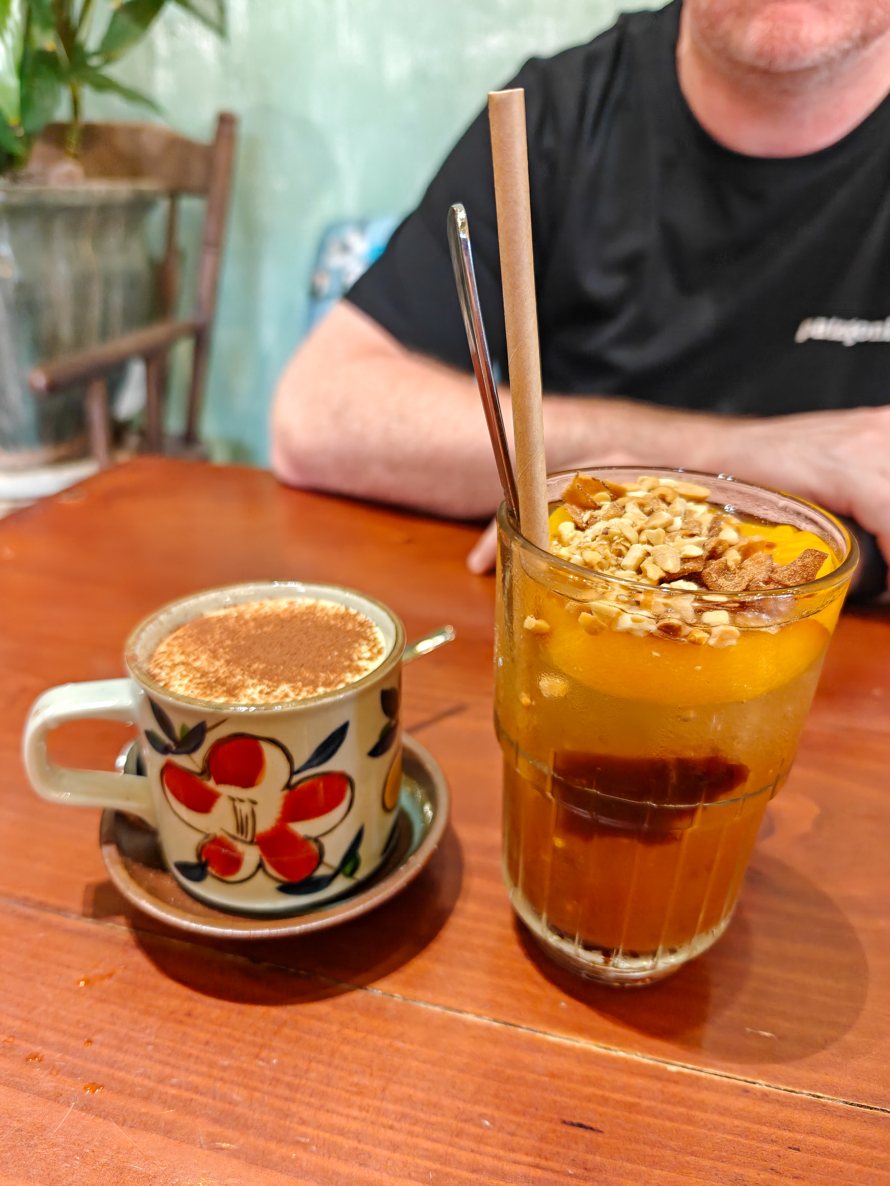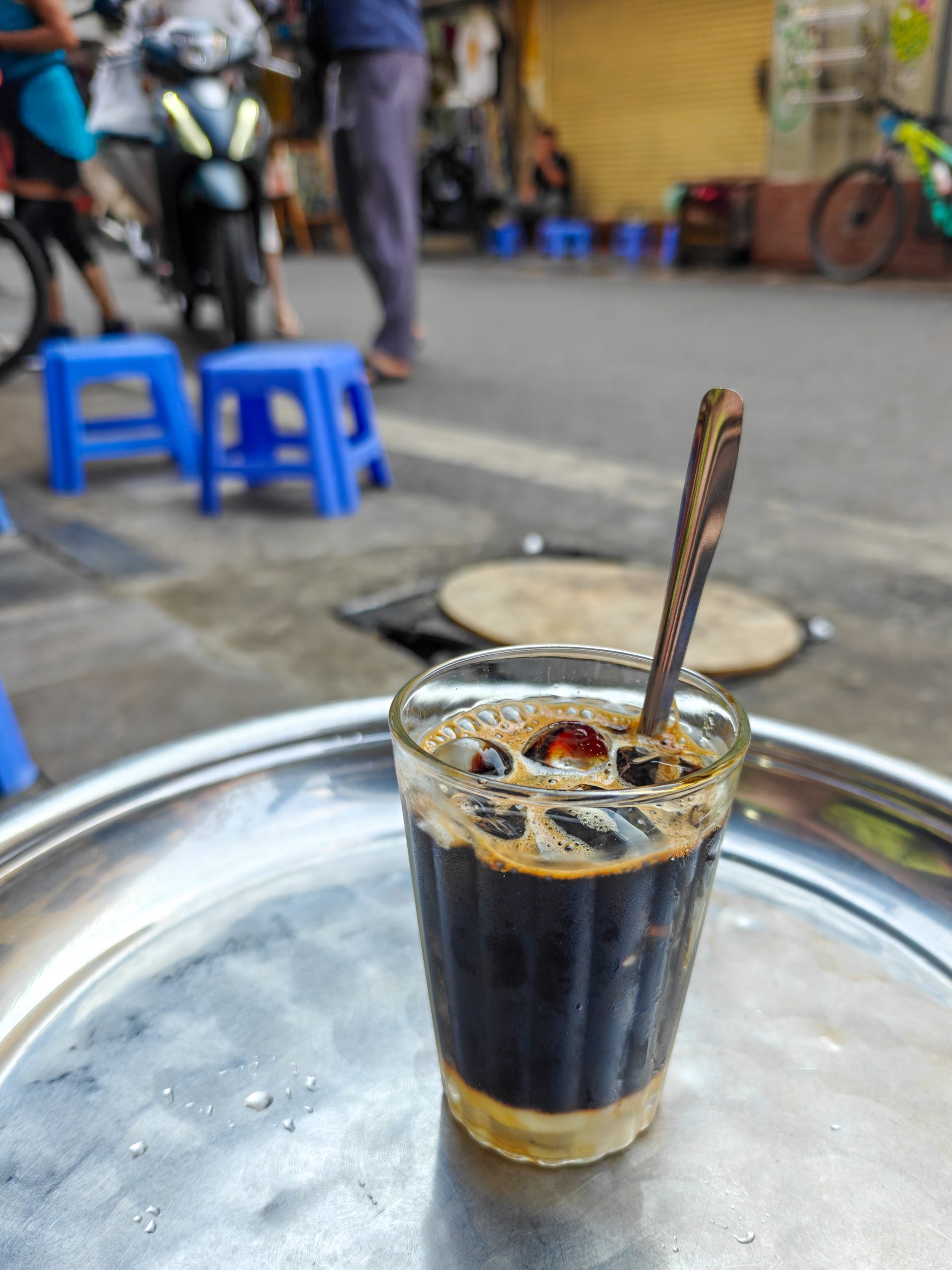 Scott tried all sorts of different coffees. He had this classic Vietnamese coffee very early in the morning on the street with people on their way to work. It came out of an esky. Rated it 10/10.