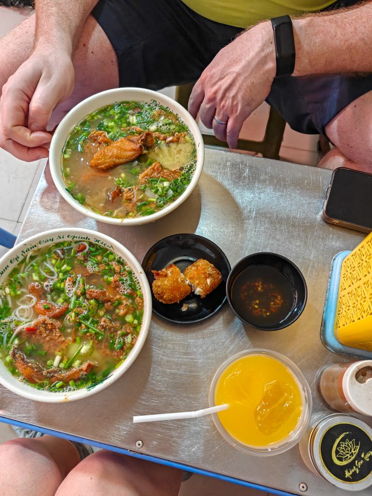 Bún Cá. Fish noodle soup with two different types of noodles, and a deep fried fish nugget on the side. The soup was loaded with fish chunks. It is funny trying to eat long noodles with chopsticks in front of a strongly blowing fan.