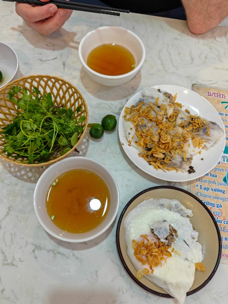 Like Bánh cuốn!! Freshly made rice sheets rolled with pork and mushrooms, generously sprinkled with fried shallots, bundled with herbs, and dunked in nước chấm. Eaten on tiny stools on the side of the street.