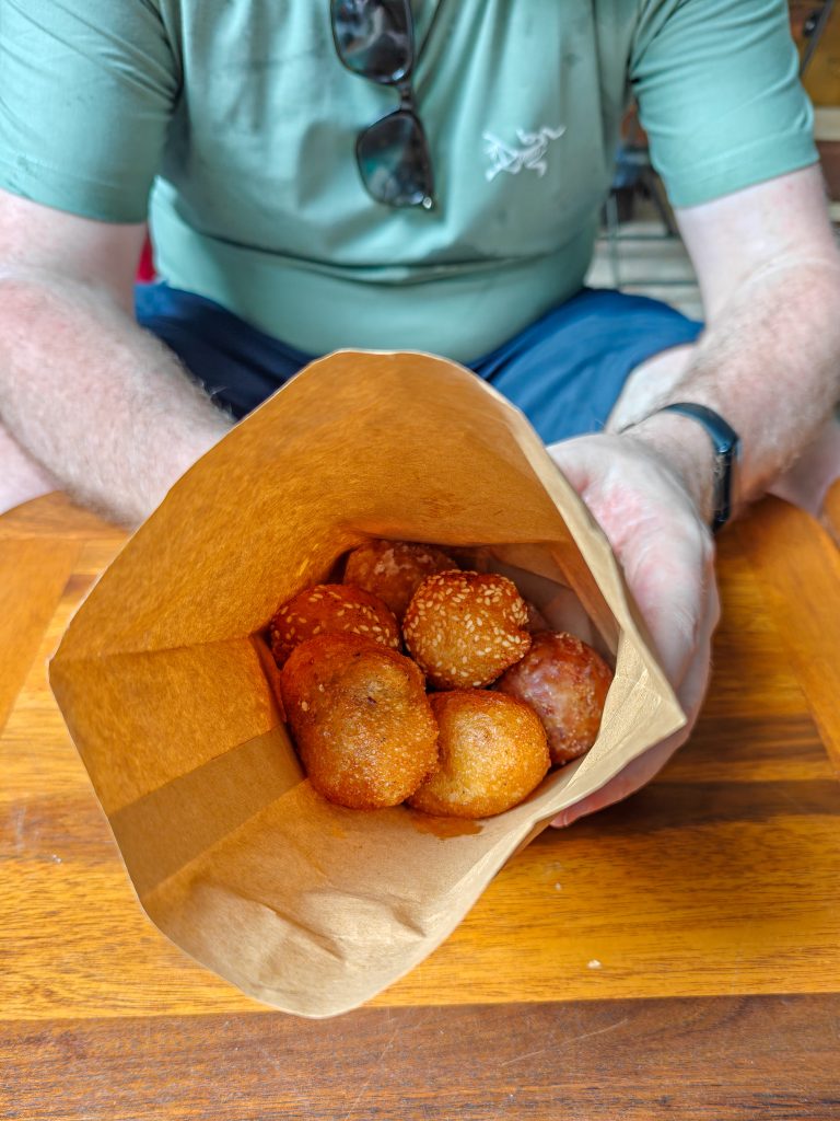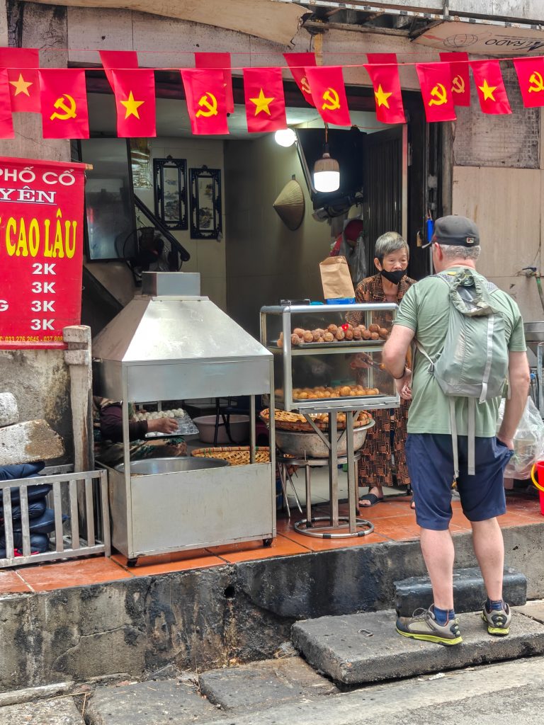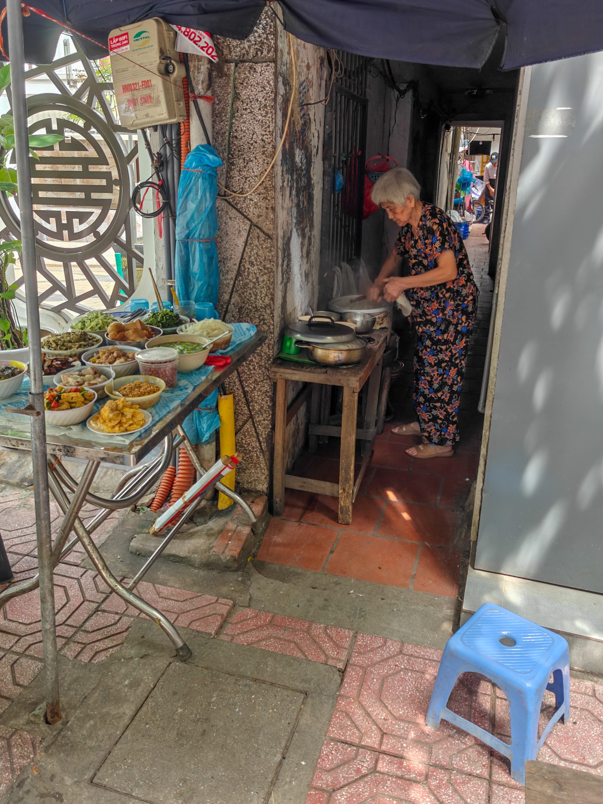 A friend saw that we were in Hanoi on Instagram and sent me a message saying I need to go find this doughnut lady on her behalf, because she still dreams about these (vegan) doughnuts. They did not disappoint. We got two of each: glutinous rice savoury, glutinous rice sweet, sesame, and sugar. They were perfectly crispy on the outside, chewy like mochi on the inside, and had crunchy bits in the middle. Amazing. Also they were ten to fifteen cents each.