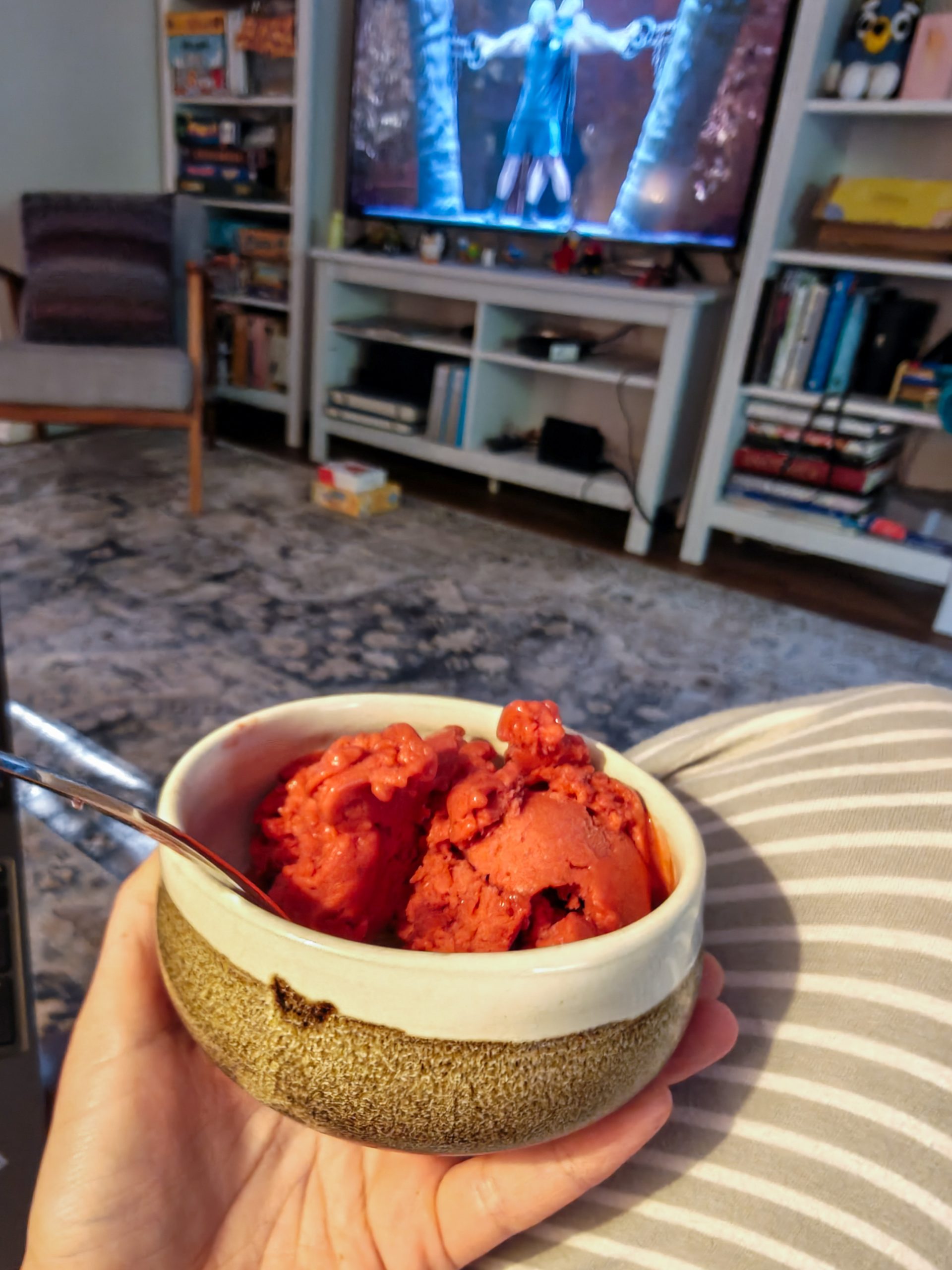 We got a Ninja Creami from Costco during Black Friday sales. (I sold the big compressor ice cream maker because we weren’t using it much.) I think the Ninja Creami is fitting our lifestyle better. My favourite mixtures so far have been strawberry sorbet (pictured), which was just cooked strawberries and a bit of maple syrup, sticky date protein ice cream, and mango sorbet. It’s nice that we can make them with healthy and lactose free ingredients.