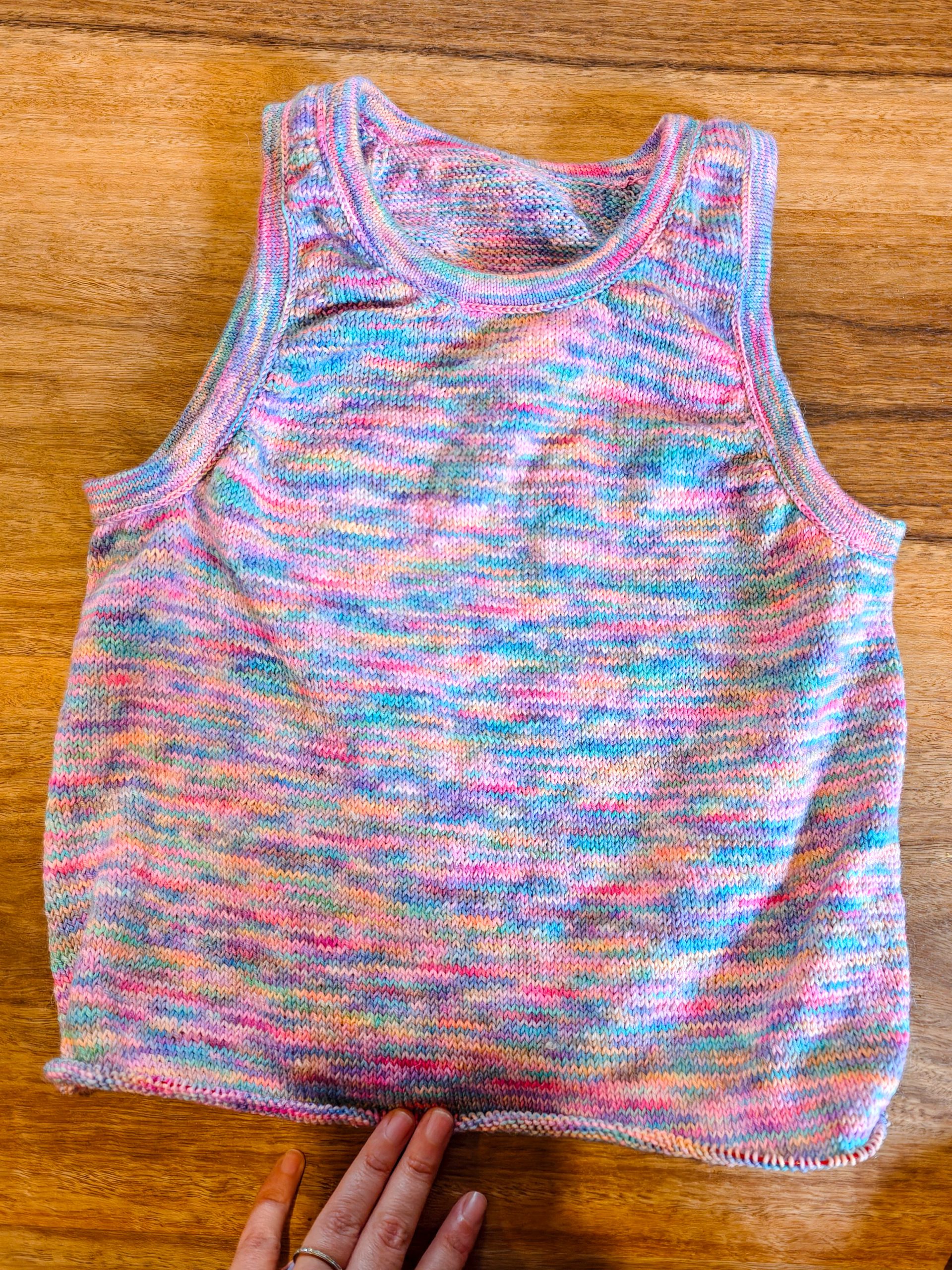 Flying along on the pastel tank top. I really like the way she designed the neckline and sleeves. Took a while to do the sewing but it’s sooo neat and tidy.